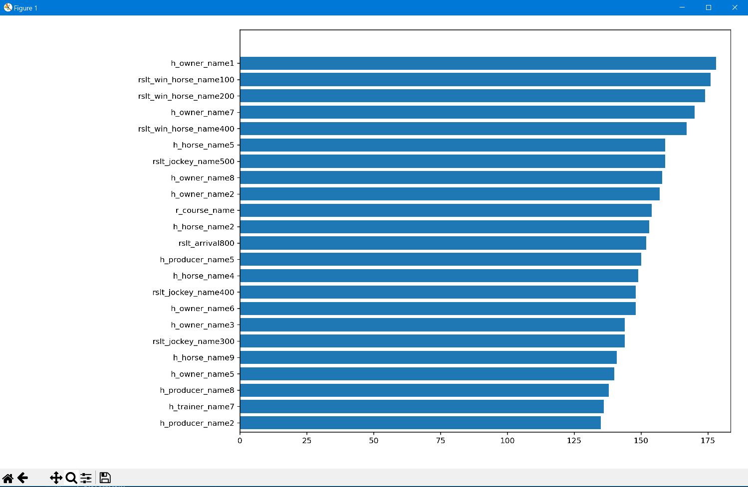 つまり「目利きできる馬主がオーナー」=「おめがねにかなった馬」=「優秀」=「勝つ確率高い」の図式が成り立ってるわけで、このメタ的な法則が「馬主名」というたった1個の特徴量に織り込まれているのではないか。